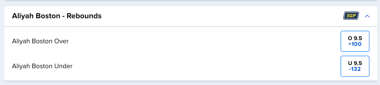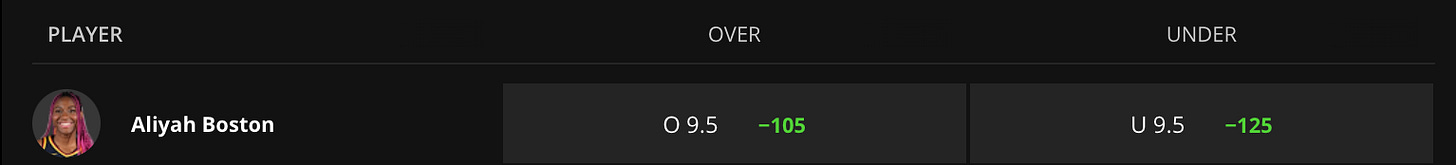 Let’s explore an example. You love Aliyah Boston over 9.5 rebounds. You place it on Draftkings (top photo below) rather than Fanduel (second photo below). You win your bet for $10.00. On DraftKings, you take home $9.50 in profit. Not bad! However, on Fanduel, that same bet would have paid you $10. You just left $.50 on the table.